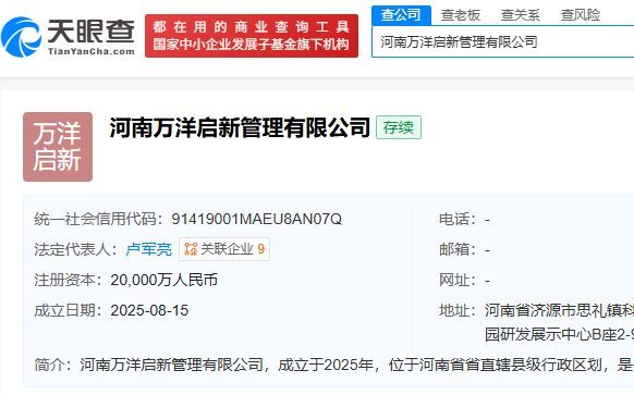 天眼查和华钰矿业公告显示,万洋启新是一家于2025年8月才成立的有限责任公司,其注册地址位于河南省济源市思礼镇科技园,注册资本2亿元,其由河南武仝运营管理有限责任公司和河南万洋锌业有限公司分别持股60%和40%。